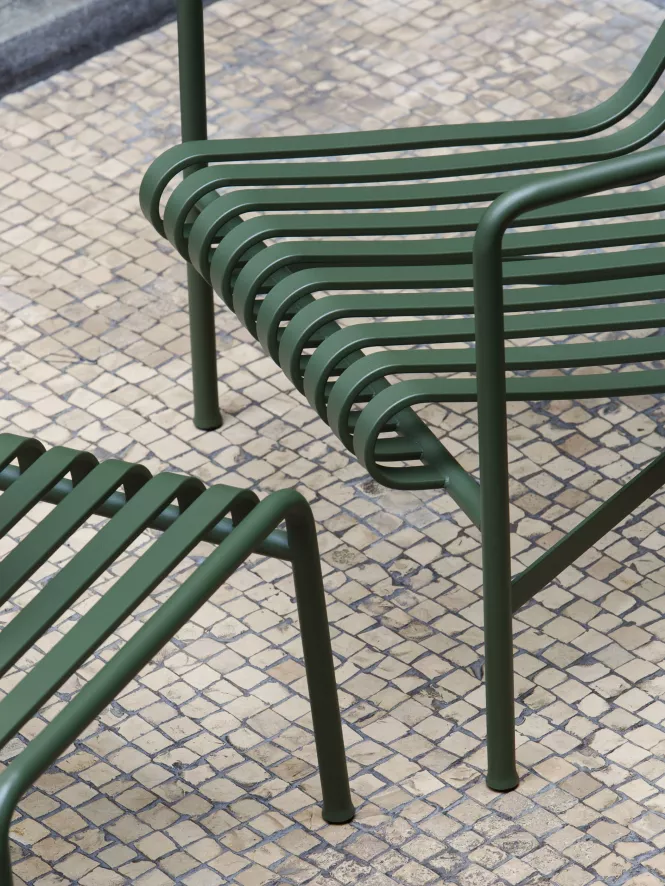 De Palissade voetenbank van Hay is gemaakt van elektro-gegalvaniseerd staal met een poedercoat en verkrijgbaar in 4 varianten: gegalvaniseerd staal, olijfgroen, lichtgrijs en antraciet. De voetenbank heeft een breedte van 65 centimeter, een diepte van 60 centimeter en een hoogte van 37 centimeter.