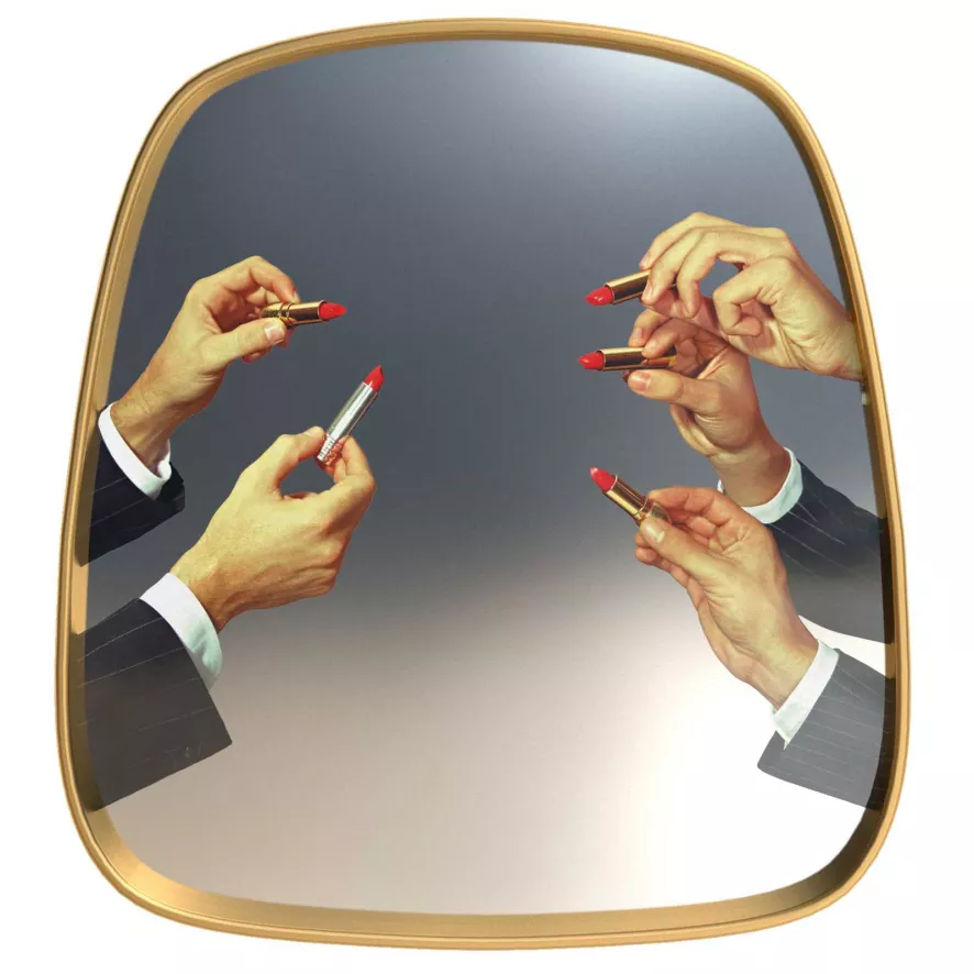 Dit is de Mirror Gold Frame spiegel 54×59 van Seletti. De spiegel heeft een hoogte van 59 centimeter en een lengte van 54 centimeter. Hij weegt 3.2 kilogram. De spiegel is gemaakt van glas en MDF met een laagje messing. De Mirror Gold frame spiegel is beschikbaar in vier verschillende uitvoeringen met ieder een andere illustratie. Ook is er een grotere, langwerpige variant beschikbaar.