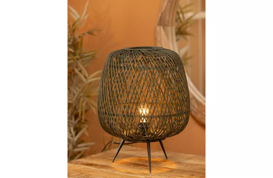 De Moza tafellamp van WOOOD is bamboe groen en staat op zwarte poten. De tafellamp heeft een diameter van 36 centimeter en een hoogte van 48 centimeter. De lamp heeft een snoer van 142 centimeter lang met een handschakelaar erop. De lampenkap is gemaakt van bamboe. De kap staat op een zwarte driepoot van ijzer. De tafellamp is geschikt voor een E27 fitting en maximaal 60 Watt. Eventuele vlekken in de Moza tafellamp kunnen eenvoudig worden verwijderd met een lichtvochtige doek, hardnekkige aanslag kan worden weggeschuurd met een licht schuurpapier.